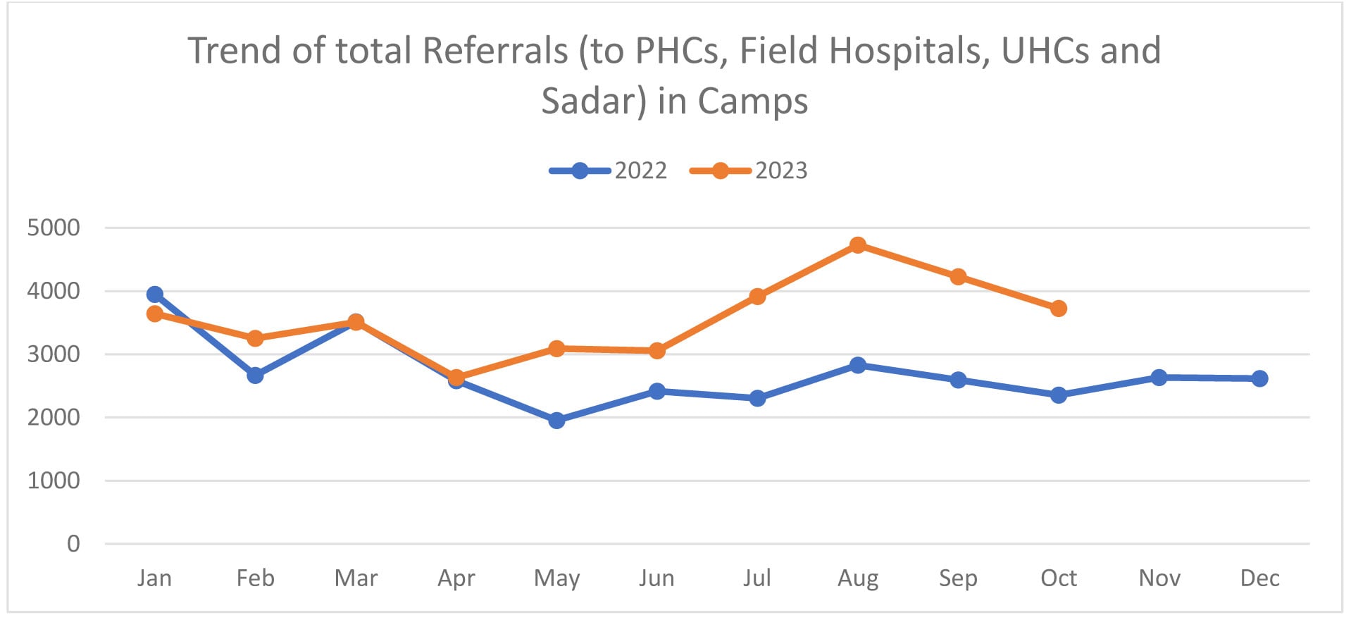 Figure 2: Trend of total referrals (to PHCs, Field Hospitals, UHCs and Sadar) in camps.