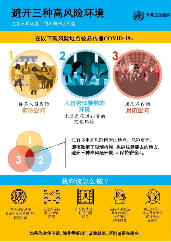 - 避免拥挤的地方、通风不良的室内场所和与他人长时间接触。更多时间呆在室外而不是室内。